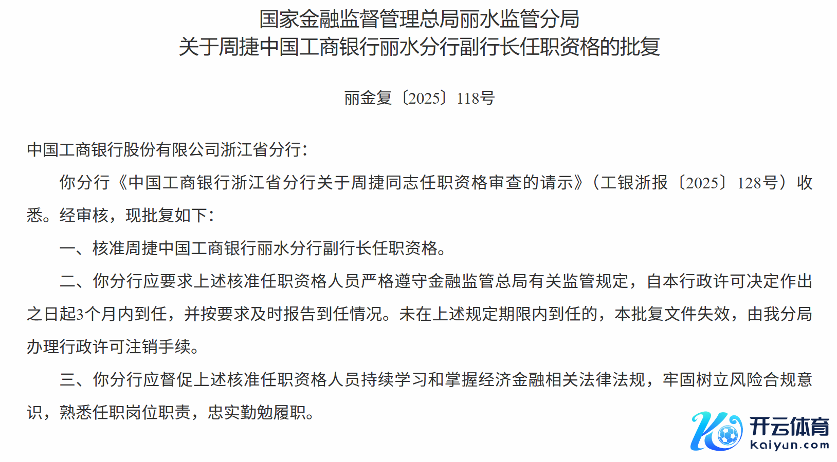 11月13日欧洲杯体育,国度金融监督处置总局丽水监管分局发布对于周捷中国工商银行丽水分行副行长任职阅历的批复,核准周捷中国工商银行丽水分行副行长任职阅历。