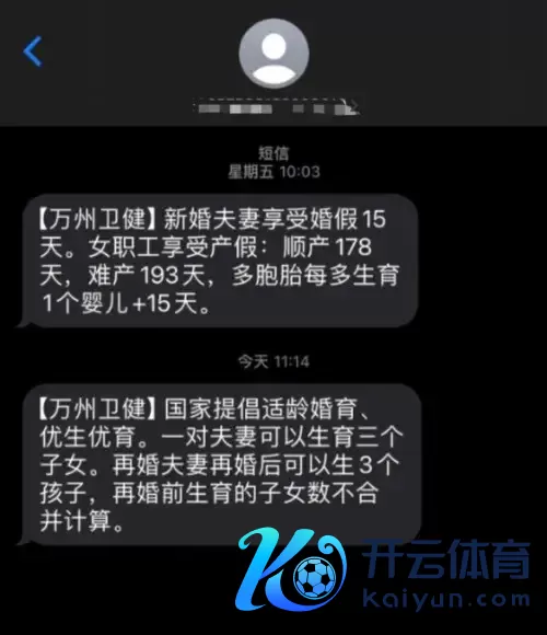 近日,有重庆万州区住户在应付平台暗示,近期接连收到当地卫健委发送的群发短信开云体育,践诺主要宣传生养计谋。11月19日上昼,大皖新闻记者从万州区卫健委获悉,如实有群发两条短信,“主若是为了宣传新的生养计谋。”