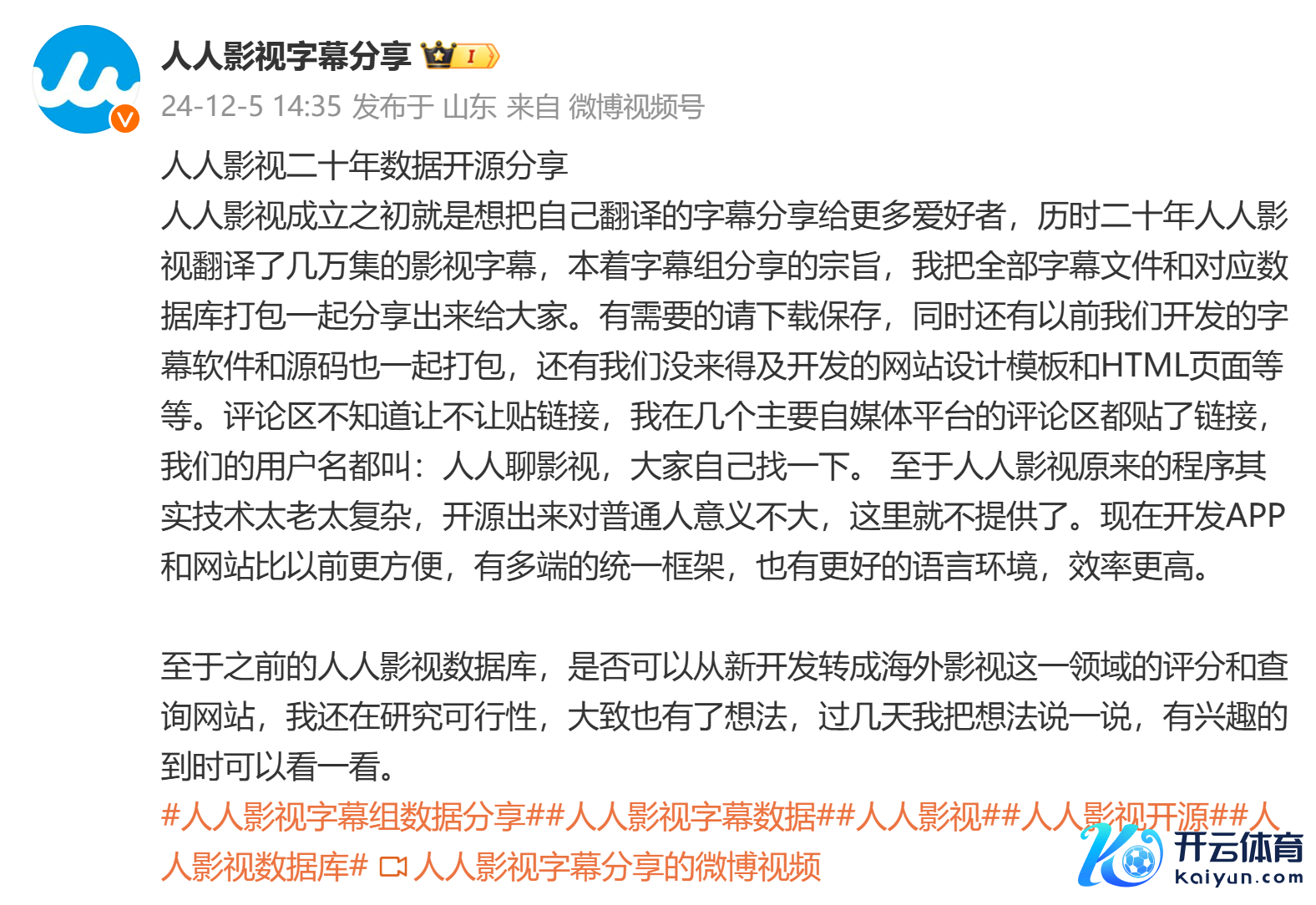 梁良在公告中默示,东说念主东说念主影视自从斥地以来,初志即是将优质的字幕翻译共享给更多的喜爱者。二十年间,他们团队翻译了几万集的影视字幕,积存了大批的字幕文献和数据库。当今本着共享的见解,他决定将这些珍稀的资源全部开源,提供给有需要的东说念主下载保存。
