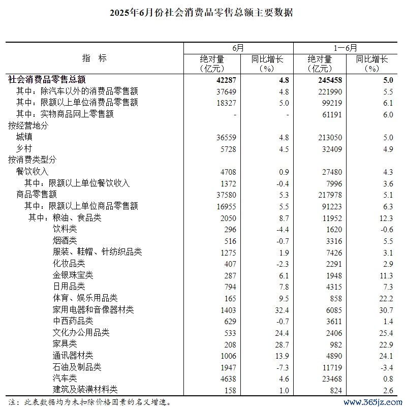 【大河财立方讯息】7月15日,据国度统计局,6月份,社会耗尽品零卖总数42287亿元,同比增长4.8%。其中,除汽车之外的耗尽品零卖额37649亿元,增长4.8%。1—6月份,社会耗尽品零卖总数245458亿元,同比增长5.0%。其中体育游戏app平台,除汽车之外的耗尽品零卖额221990亿元,增长5.5%。