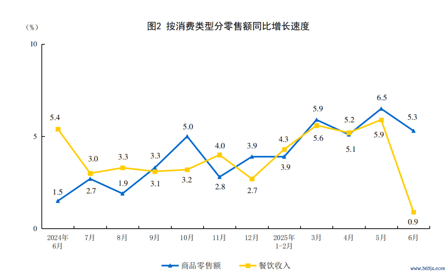 按耗尽类型分,6月份,商品零卖额37580亿元,同比增长5.3%;餐饮收入4708亿元,增长0.9%。1—6月份,商品零卖额217978亿元,增长5.1%;餐饮收入27480亿元,增长4.3%。