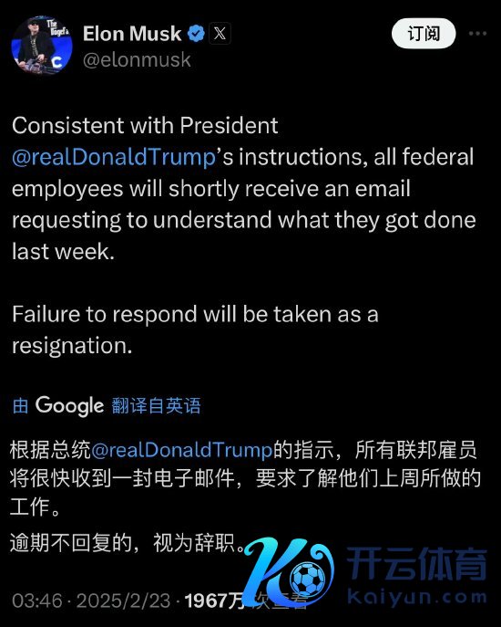 随后,他发文暗示,“凭据总统特朗普的携带,通盘联邦雇员将很快收到一封电子邮件,条目讲解他们上周所作念的职责。过时不恢复的,视为下野。”
