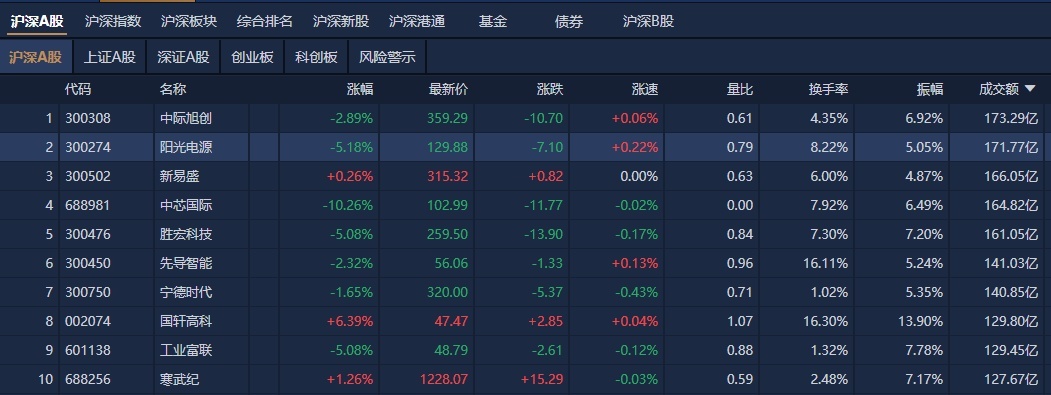 沪深两市成交额2.12万亿,较上一个往过去缩量3002亿。个股方面,中际旭创全天成交额超173亿元居首,阳光电源成交额也在170亿元以上,新易盛、中芯国外、胜宏科技等个股成交额靠前。
