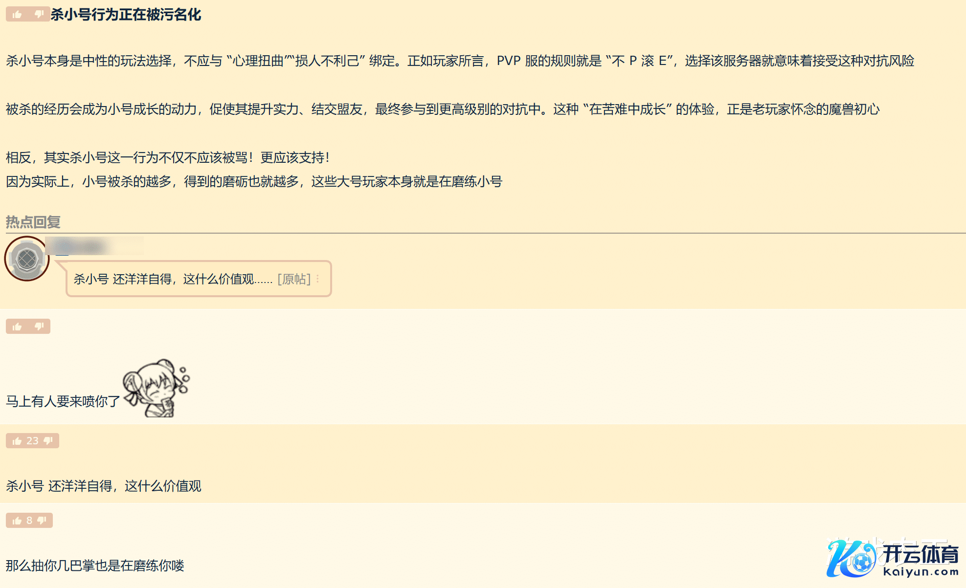 为什么说这个蓝贴很有兴致呢?有兴致的点在于它保护了PVP的规章,因为PVP的规章自身就是碰见玩家就能打,既然这种情况下雷火也不好去骚扰,是以套上了一个保护光环,自身就是说PVP形式点到限定,而关于新玩家来说,一个小时被打败一次回到回生点似乎亦然能摄取的事情,是以在这点事情上找到了一个均衡。