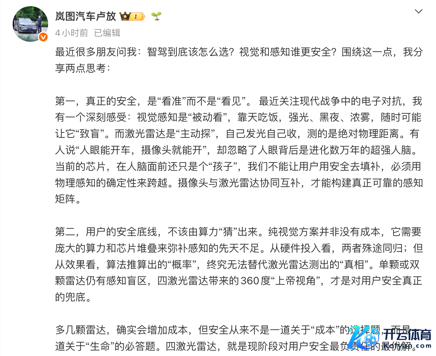 网科技讯 3月26日,针对智能驾驶途径中,遴选激光雷达和纯视觉决议背后的互异,岚图汽车科技股份有限公司董事长卢放以为,