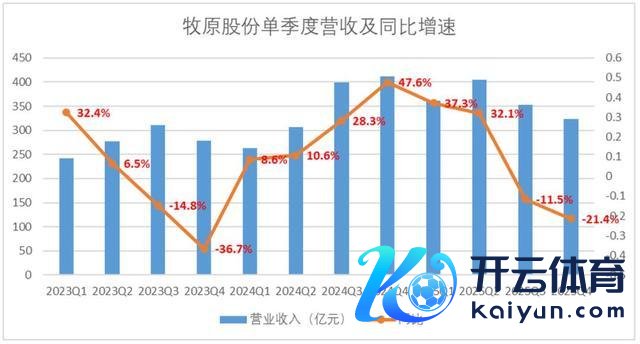 拆分季度来看,2025年第四季度,牧原录得买卖收入324亿元,同比大幅度下滑21.4%。2025年下半年贯串两个季度营收负增长,产能延伸的红利没能抗拒周期下行的压力。
