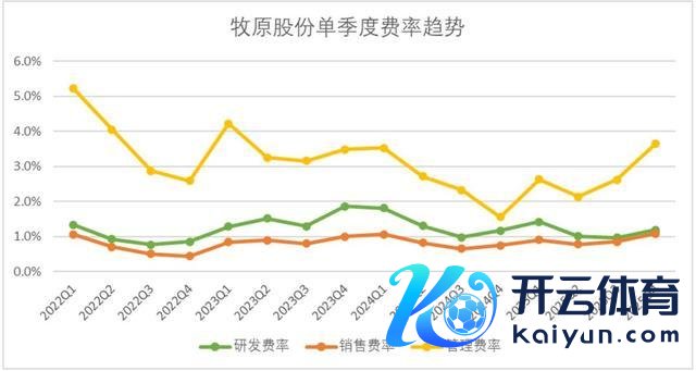 用度层面,2025年第四季度牧原股份的销售用度、惩办用度、研发用度区分录得3.5亿元、11.8亿元、3.9亿元,从费率趋势来看,销售用度督察在1.1%、研发用度为1.2%,环比微增了20bp。